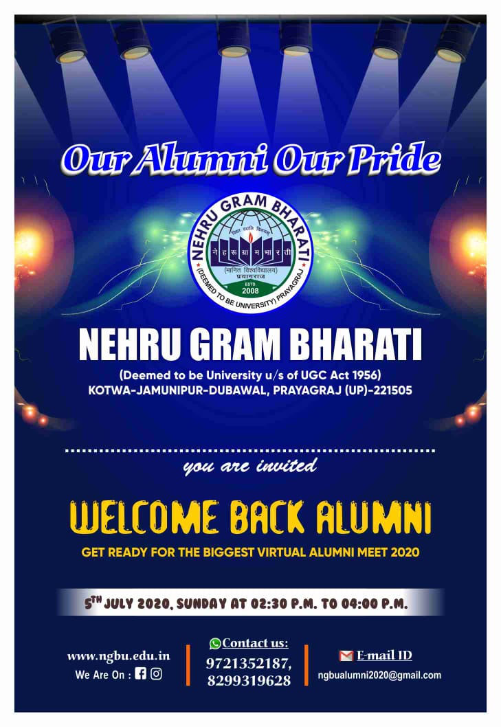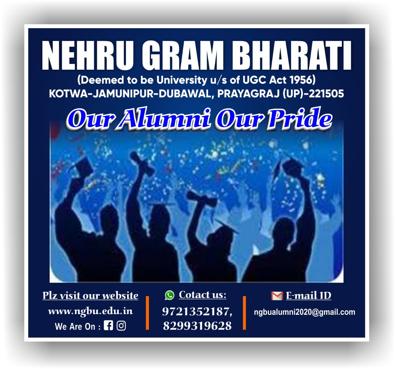 The Nehru Gram Bharati Alumni Society of Nehru Gram Bharati (Deemed to be University) intends to offer a platform, physical as well as virtual, for the alumni of all identities, backgrounds and experiences-across the globe to reach out to and build bonds with the campus community of our Institution to create and deepen the sense of belonging to NGB(DU), Prayagraj. Our ever-growing family of NGB alumni is sharing their diverse experiences and ideas to effect change from inside and outside the education system. Sharing stories and updates about the life and accomplishments of our proud alumni and how they are staying engaged with their alma mater helps to create a thriving community and forge connections between alumni and present generation of students.
