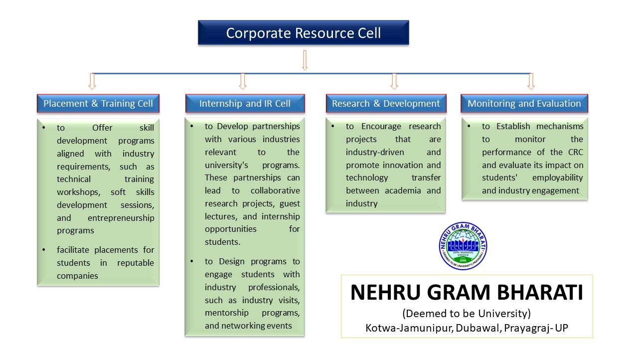 Establishing a Corporate Resource Cell (CRC) at Nehru Gram Bharati (Deemed to be University) can be a strategic move to bridge the gap between academia and industry and will foster the industry-academia collaboration, facilitating internships and placements, organizing industry-relevant workshops and seminars, etc.